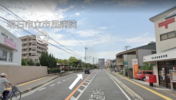 高津橋の交差点を右折していただき、道なりに約1.2km進んでいただくと左手に明石市立市民病院が見えてきます。