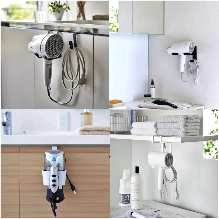 僕が調べたところ、「洗面台の扉に引っ掛けるタイプ」「壁面に取り付けるタイプ」「棚下に取り付けるタイプ」「置き型タイプ」の4つタイプのドライヤー収納アイテムがありました。